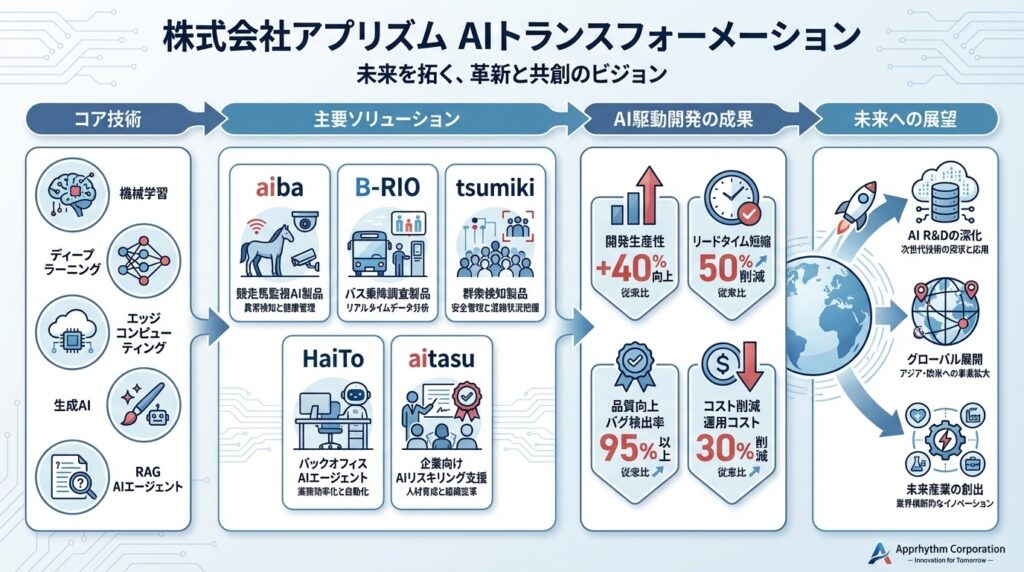 株式会社アプリズムは、AI(人工知能)・生成AI・AIエージェント技術を駆使し、企業のデジタルトランスフォーメーション(DX)を強力に推進いたします。大手メーカー様の先端技術研究部署、国立研究機関、大学との産学連携により培った確かな技術力と豊富な実績で、お客様の企業価値向上と持続的な競争優位の確立をサポートします。
