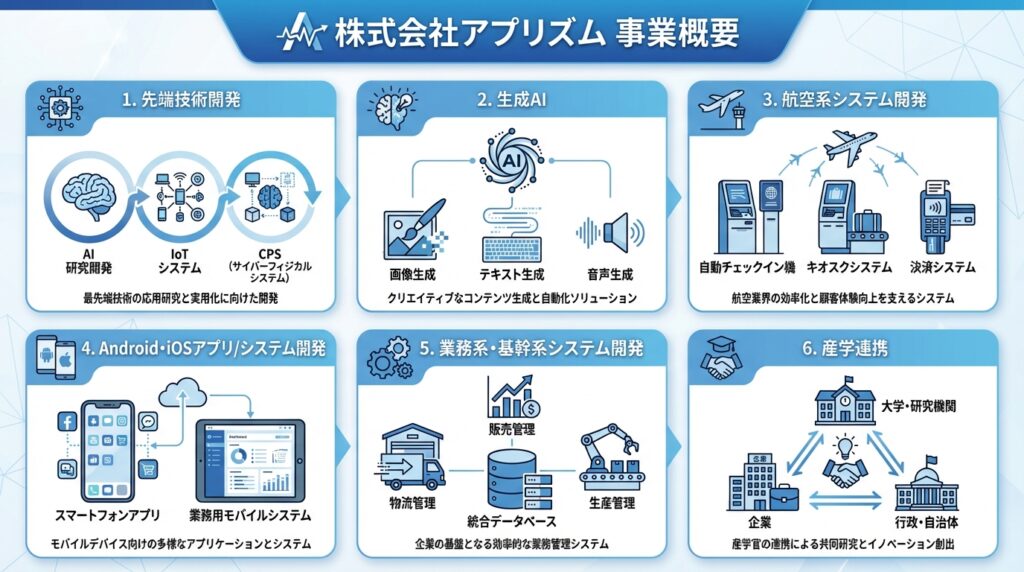 株式会社アプリズムは、経営理念「最先端技術で未来を創造する」のもと、AI(人工知能・機械学習)、IoT、生成AI、ハイパースペクトルイメージング技術を活用したシステム開発・研究開発を推進しています。